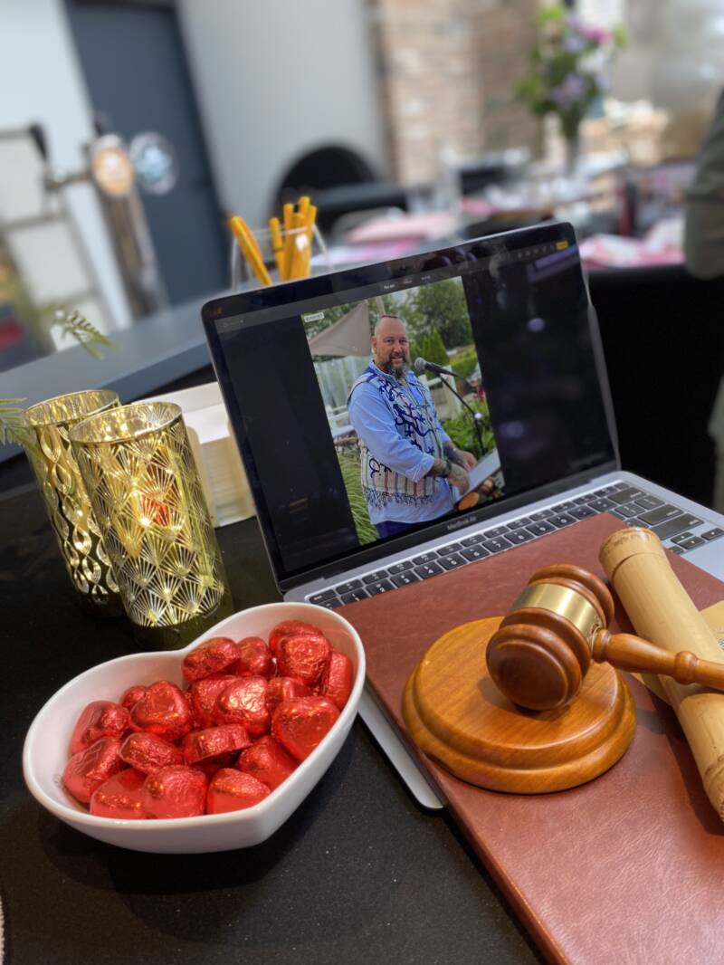 Antoine heeft ons getrouwd,Tijdens de gesprekken dacht hij met ons mee en niks was te gek. Net als wij is hij open mind en kleurt hij graag buiten de lijntjes. Dat zorgde ook voor dat de ceremonie heel persoonlijk was en precies bij ons paste. We hebben gelachen en werd ook ook een traantje weggepinkt.